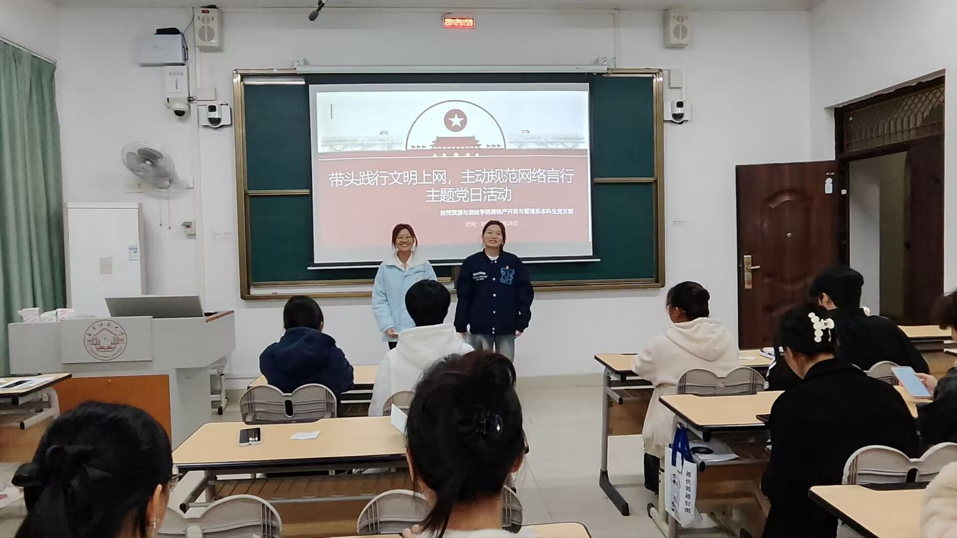 为深入贯彻网络文明建设相关要求,引导党员规范网络言行、守护网络文明,2025年11月28日晚,南宁师范大学自然资源与测绘学院房地产开发与管理系本科生党支部,在武鸣校区武1—411教室开展了“带头践行文明上网,主动规范网络言行”主题党日活动,支部全体党员全程参与。