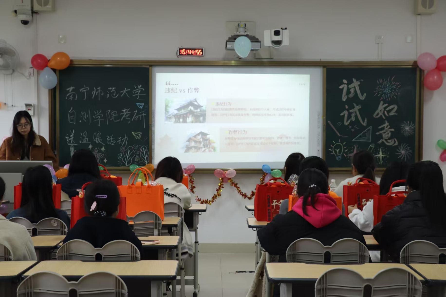 12月16日,自然资源与测绘学院于武鸣校区2号教学楼104教室为正在紧张备考的考研学子组织了一场温馨的送温暖活动及考研诚信教育活动,学院全体辅导员及考研学生代表参与本次活动。