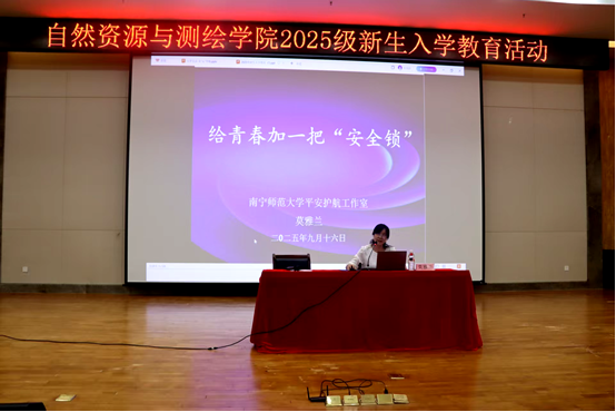 为切实提升2025级新生的安全防范意识与自我保护能力,助力其顺利适应大学新环境,9月16日,自然资源与测绘学院在图书馆报告厅成功举办新生安全教育专题讲座。本次讲座由学院党委副书记莫雅兰担任主讲,学院全体2025级新生参与讲座。