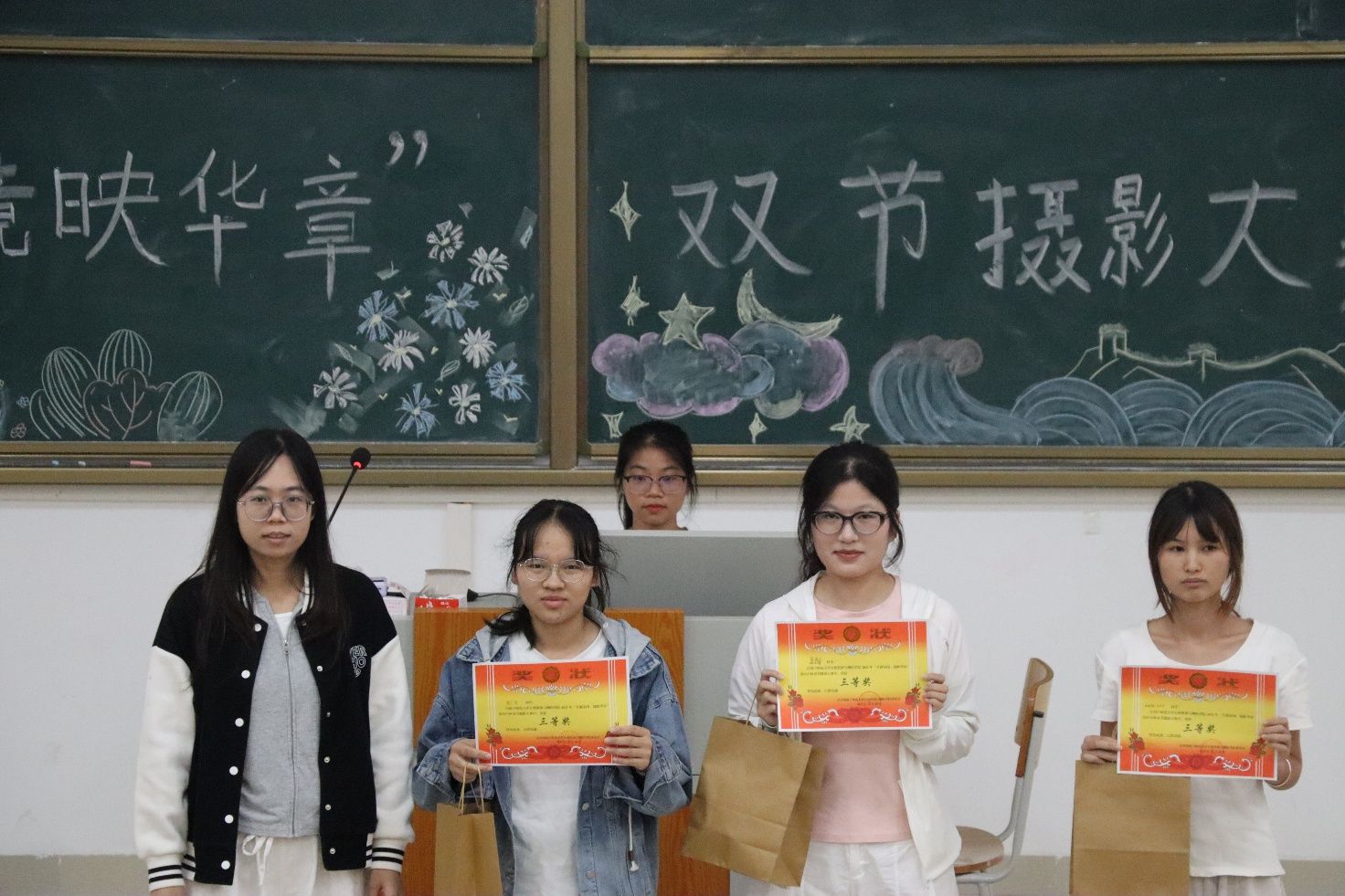 决赛中,参赛选手紧扣“家国同庆”主题,分别从作品内涵、构图设计、创新意识、主题契合度及拍摄技术等维度进行阐述。选手们在分享创作理念时饱含真情实感,讲述作品打磨过程彰显专注与执着,引发全场观众的深切共鸣。随后,团委书记张慧荣老师为本次大赛作总结发言。她肯定了工作人员细致周密的组织筹备,也表扬了部分选手在主题表达与摄影技术上的突出表现。同时,她也指出了部分作品在构图逻辑与主题深度上仍有提升空间,鼓励同学们在今后的创作中继续打磨、不断进步。经评委组依据规则进行综合评定,最终确定获奖名单如下:一等奖获得者劳美玲;二等奖获得者刘建琼及“摸鱼组”;三等奖获得者蓝晓乐、陈广炎及“熊出没队”。
